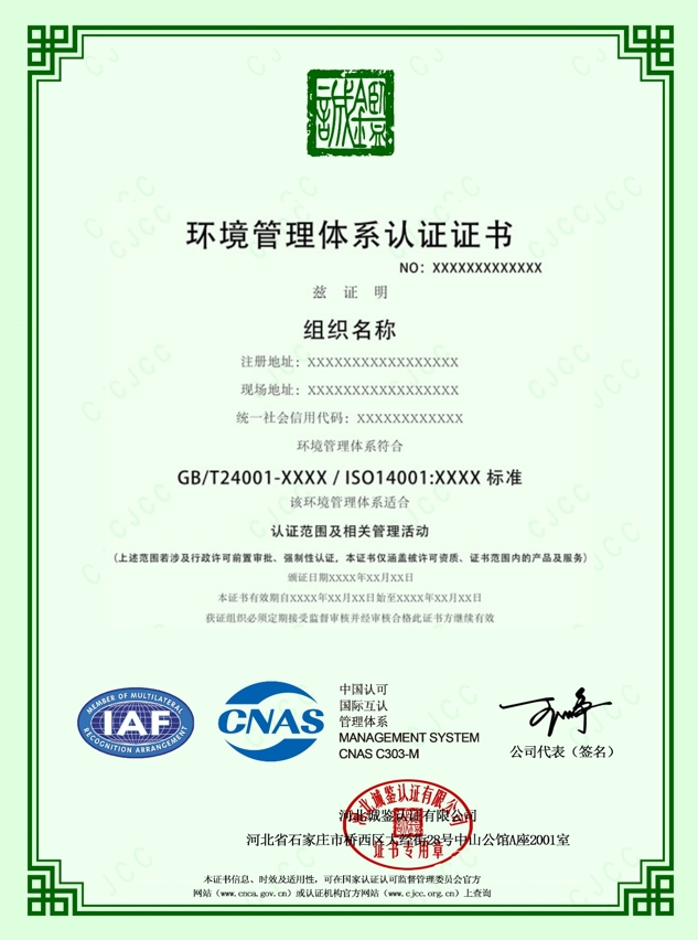 河北誠鑒認證有限公司(簡稱誠鑒認證/CJCC),創立于二零一七年,經國家認證認可監督管理委員會(CNAS)批準(批準號CNCA-R-2018-412),中國合格評定國家認可委員會(CNAS)認可(注冊號:CNAS C303-M)),是從事質量管理體系、環境管理體系、職業健康安全管理體系認證,具有獨立法人資格的第三方認證機構。